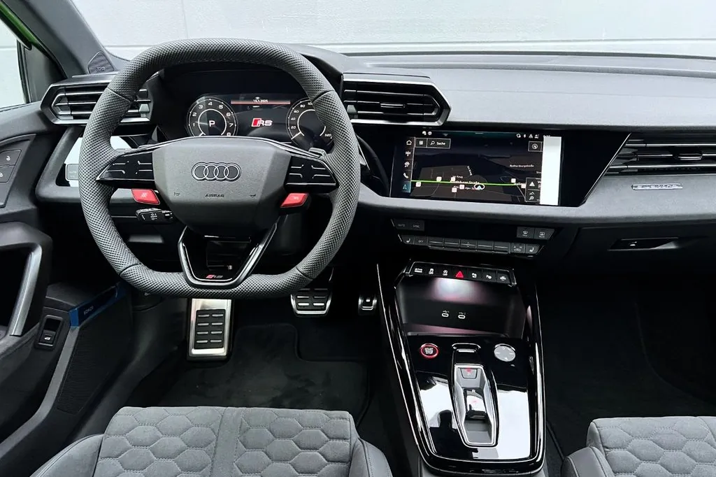 Audi RS3 - Оснащён 2.5-литровым турбомотором на 394 л.с. и полным приводом quattro с системой распределения тяги RS Torque Splitter, обеспечивая разгон до 100 км/ч за 3,8 секунды. Инженерные решения включают адаптивную подвеску RS, усиленные тормоза и режимы вождения RS Performance и Drift. В салоне — цифровая приборная панель Virtual Cockpit Plus, мультимедиа MMI с 10,1-дюймовым экраном и RS-дизайн с контрастной прострочкой. Дизайн экстерьера подчёркивают агрессивный аэродинамический обвес, овальные выхлопы и спортивные детали RS. Среди ассистентов — адаптивный круиз-контроль, удержание в полосе и система кругового обзора.