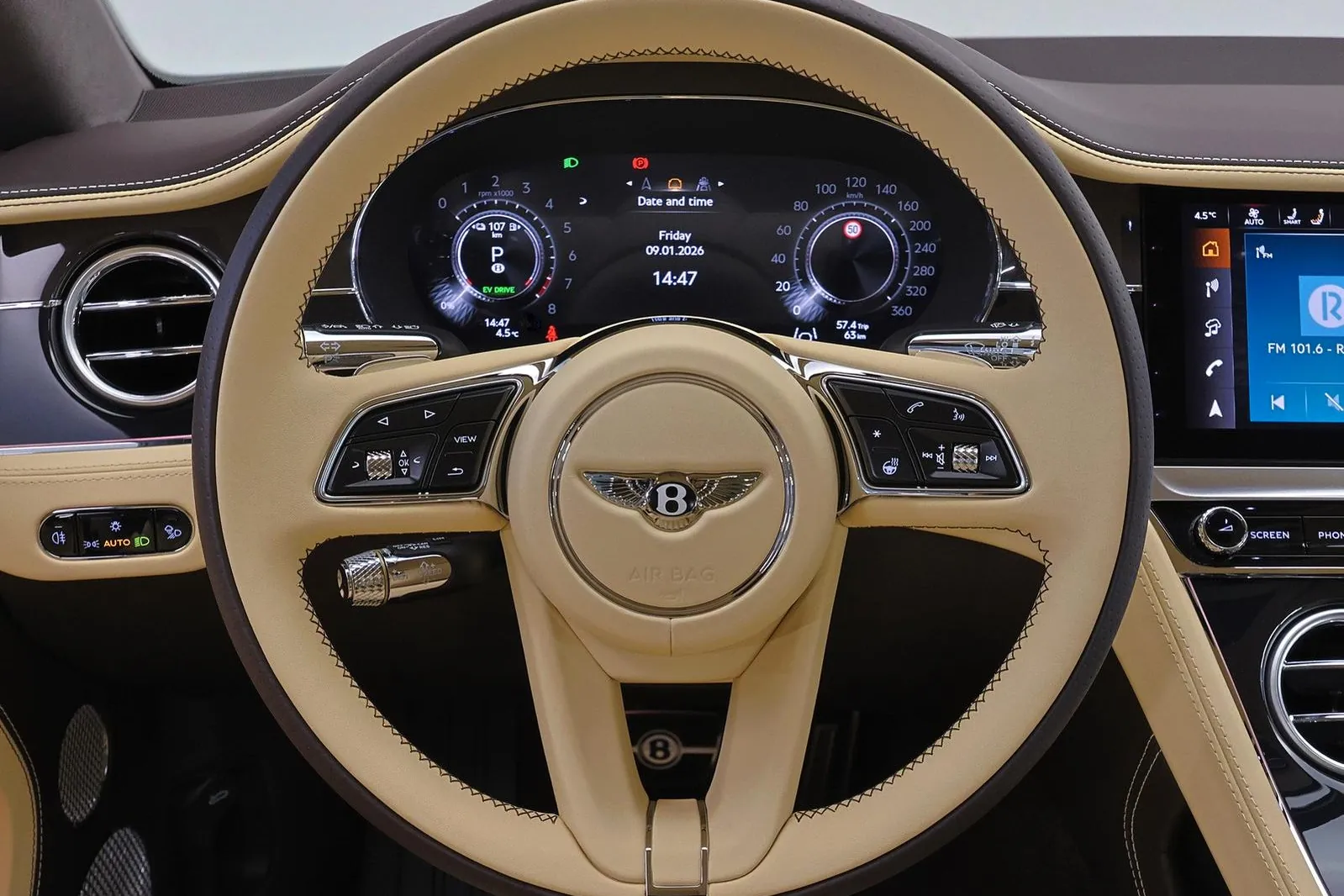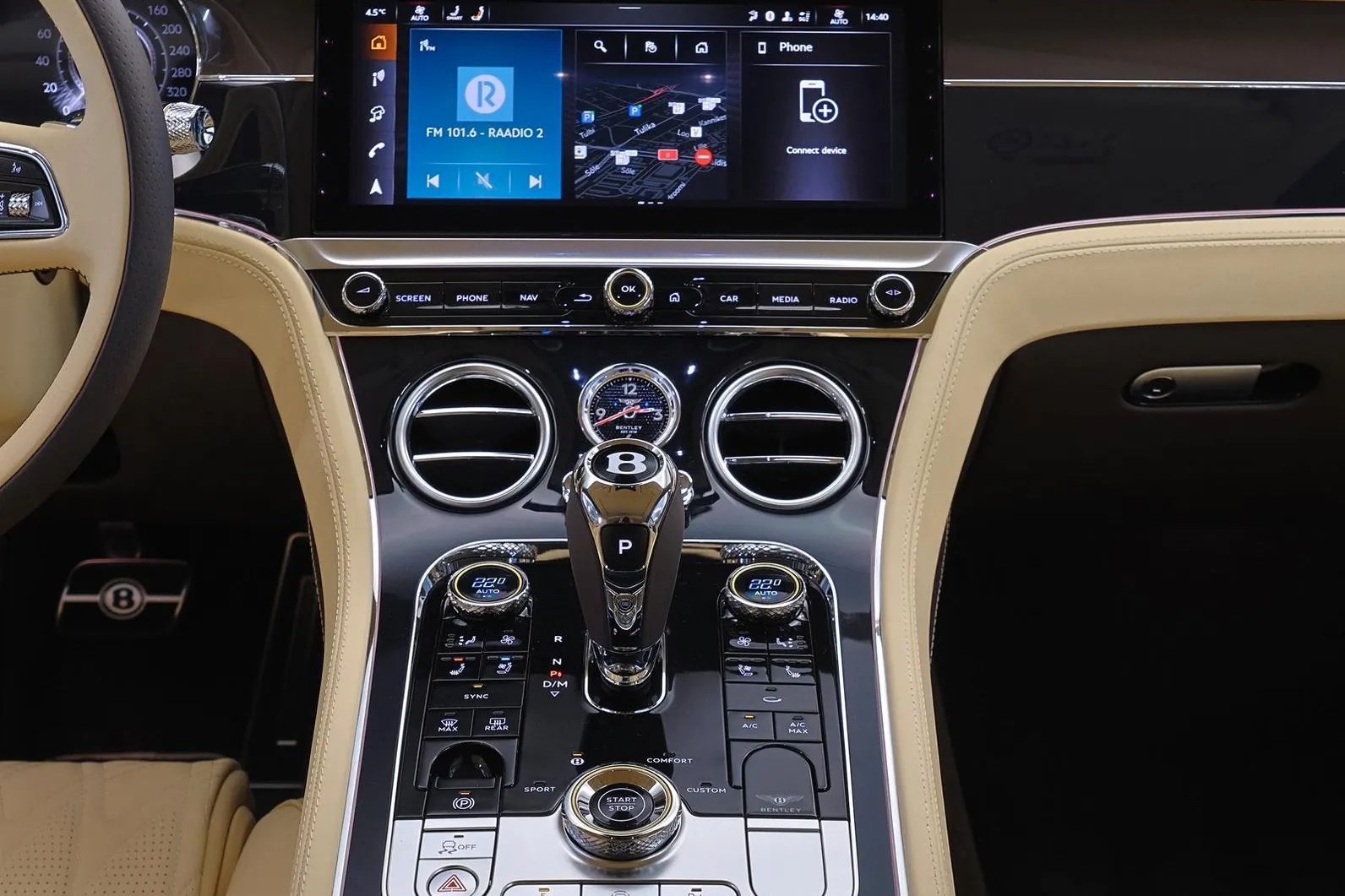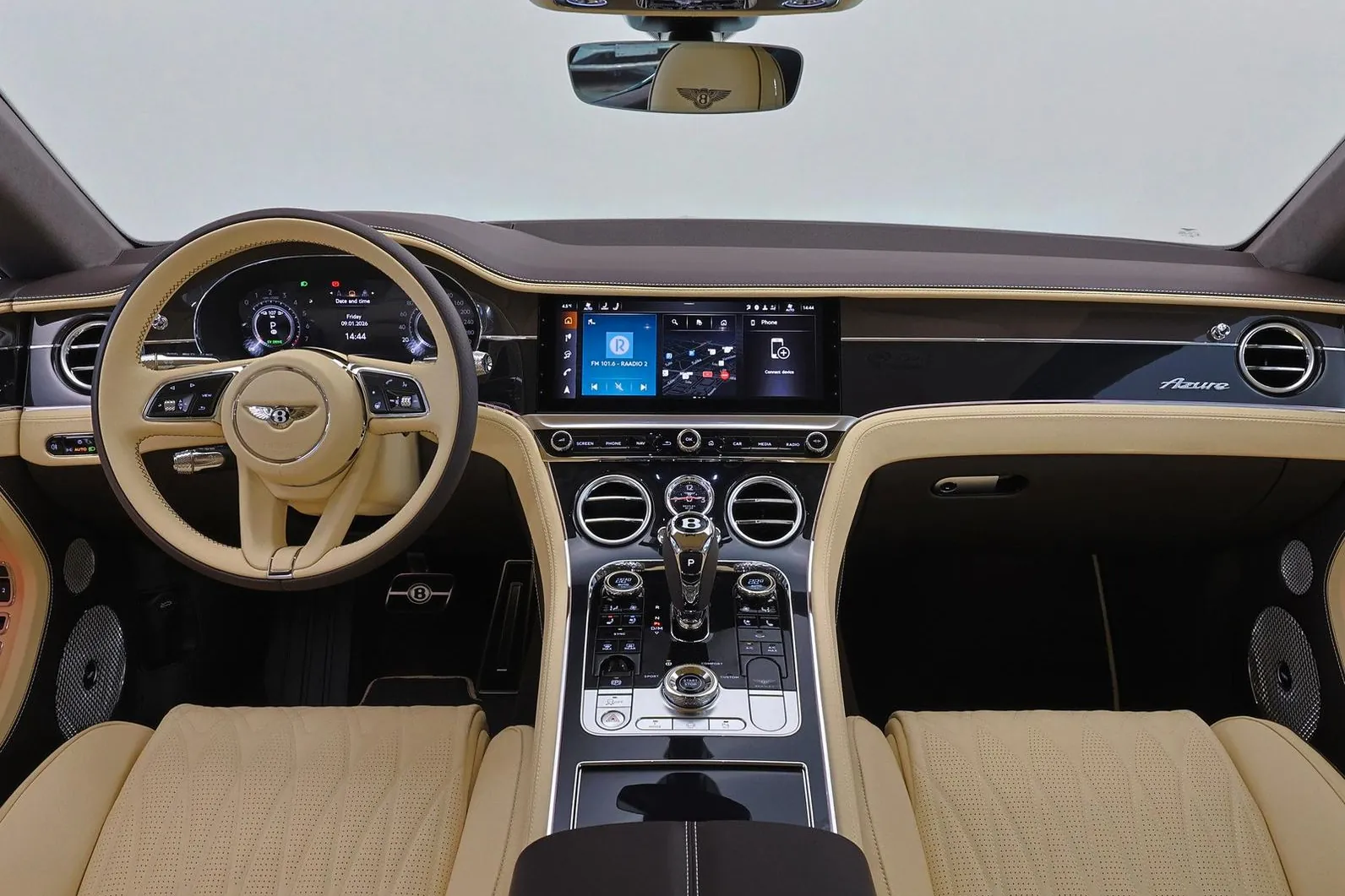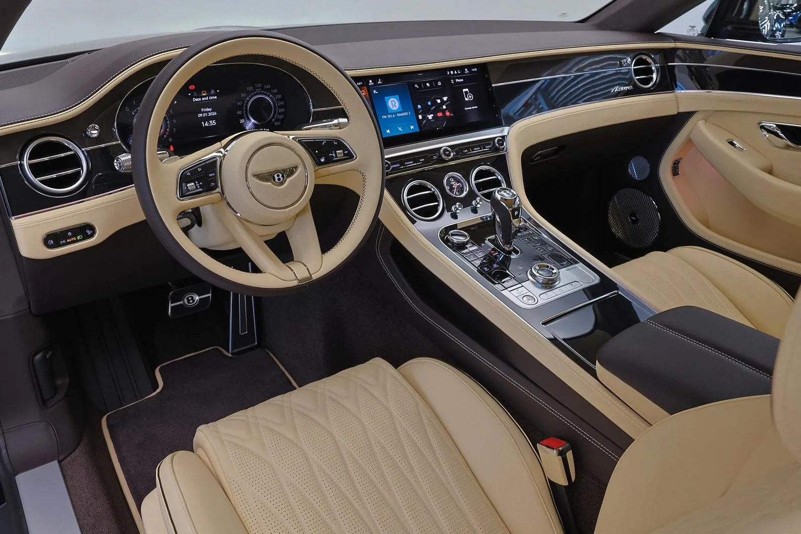 Bentley Continental GT Azure — это роскошное премиальное купе класса Gran Turismo, сочетающее элегантный британский стиль, высокий уровень комфорта и современную гибридную производительность в максимально утончённом исполнении Azure. Под капотом установлена гибридная силовая установка на базе 4.0-литрового бензинового V8 с двойным турбонаддувом и электромотора, суммарно развивающая около 500 кВт (≈680 л.с.) и крутящий момент 930 Н·м. Разгон до 100 км/ч занимает около 3.7 секунды, а максимальная скорость достигает примерно 270 км/ч. Автомобиль оснащён автоматической коробкой передач с двойным сцеплением и системой полного привода, обеспечивающими плавное, но очень уверенное ускорение, высокий уровень устойчивости и исключительный комфорт как в городе, так и на дальних поездках. Исполнение Azure делает акцент не столько на максимальной агрессии, сколько на роскоши, расслабленном характере и комфорте премиального Gran Turismo. Модель отличается фирменной вертикальной решёткой радиатора, эксклюзивными 22-дюймовыми колёсами Azure, более утончёнными хромированными акцентами, сиденьями с функциями подогрева, вентиляции и массажа, а также технологиями, ориентированными на комфорт и самочувствие пассажиров. По сути, это одна из самых «спокойно-роскошных» версий Continental GT.