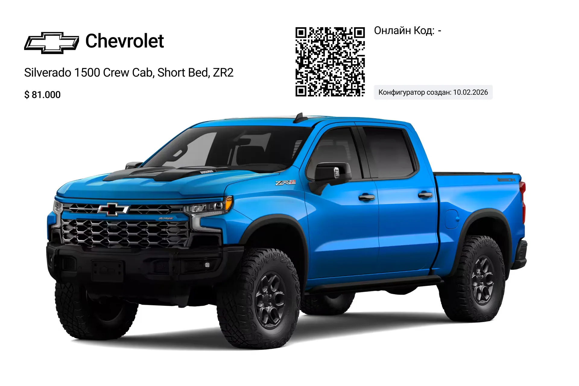 - Модель Silverado 1500 Crew Cab, Short Bed, ZR2, 4WD